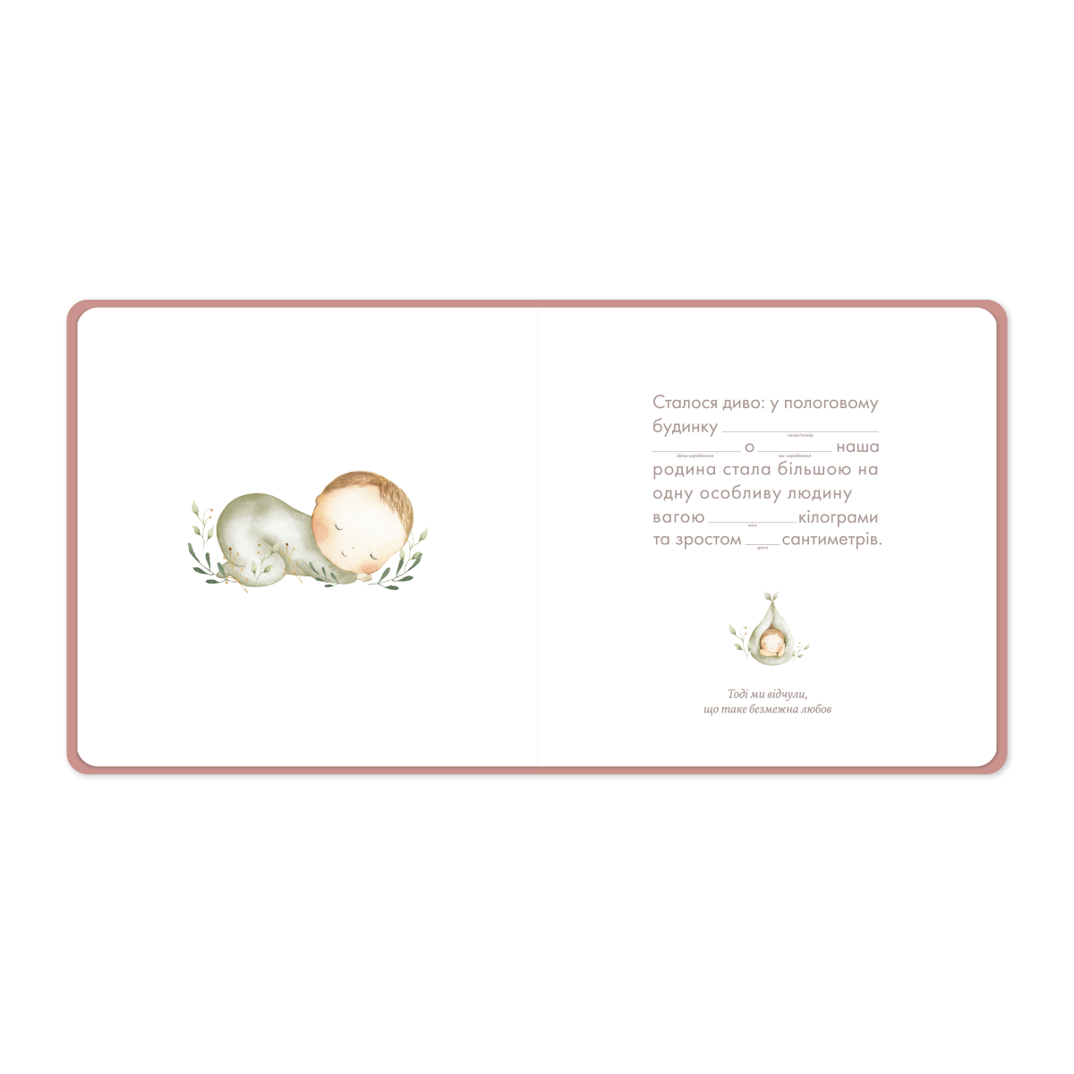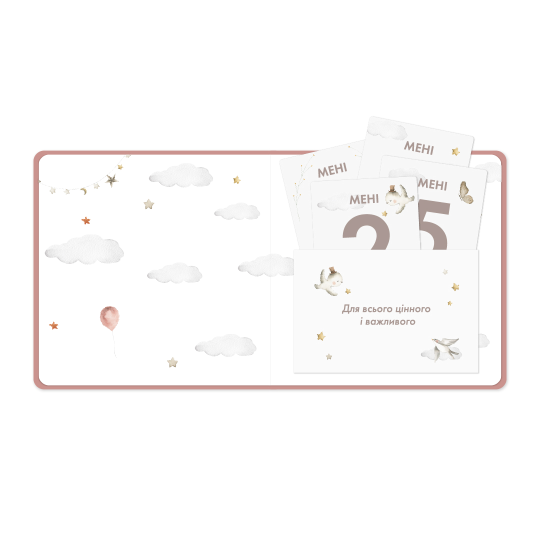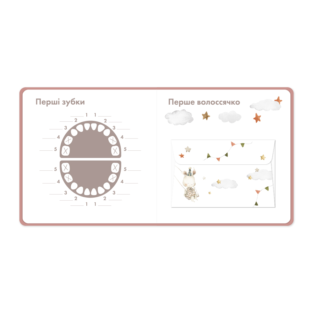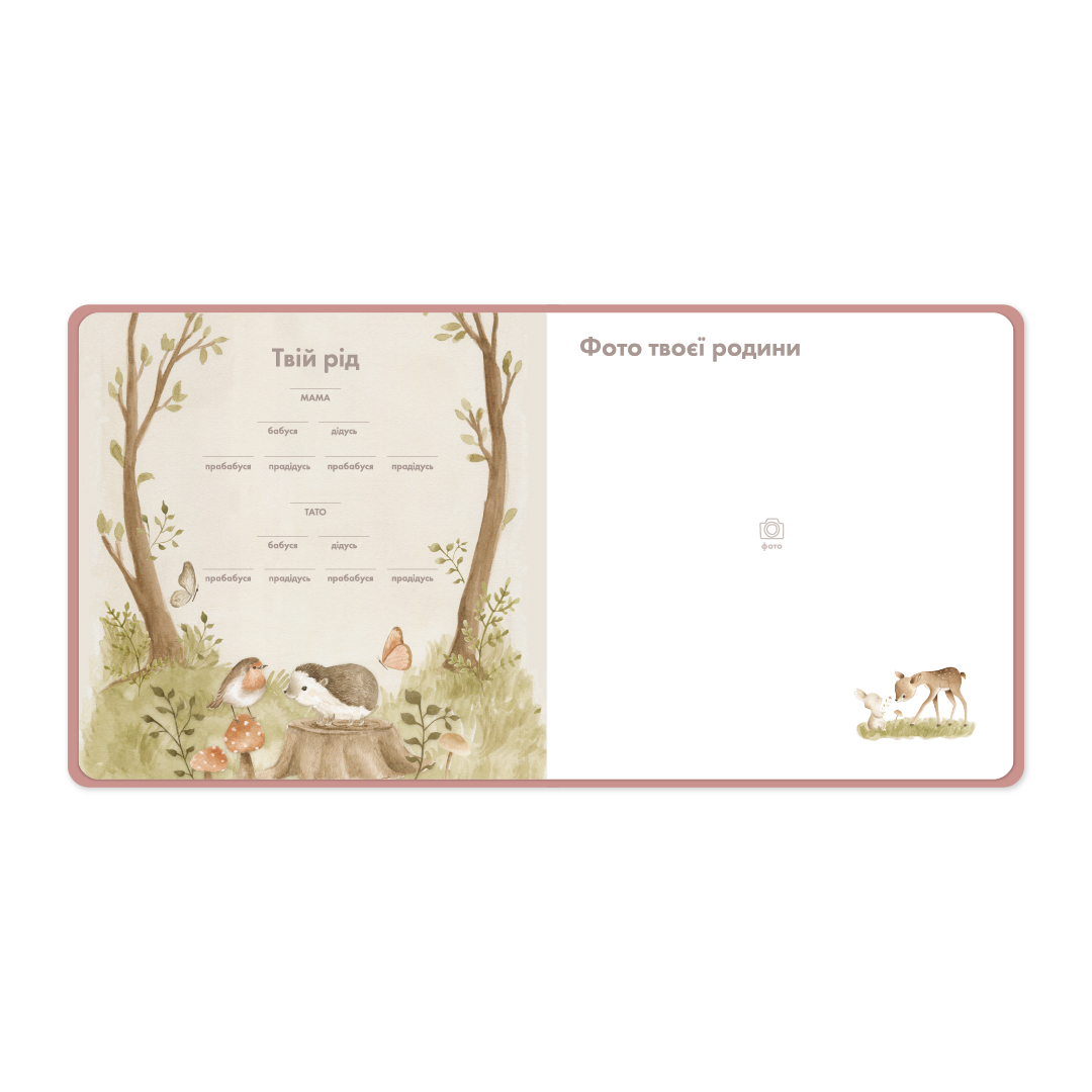 Ось, що ще ви знайдете в фотоальбомі: генеалогічне дерево, конверт для волоссячка, карту для зображення перших зубок та 12 карток — по одній на кожен місяць — для того, аби відстежувати ріст дитини.