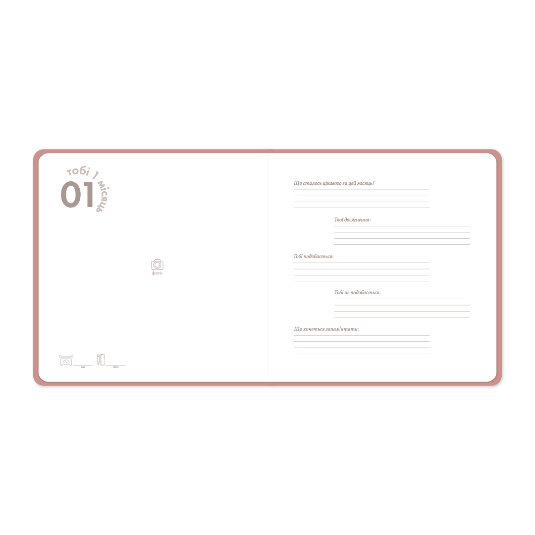 Цей фотоальбом — скарбничка спогадів про те, що змусило дитину вперше усміхатися та вперше сміятися. Голосно-голосно. Про те, що викликало сльозинки в цих величезних очах, та про те, без якої іграшки дитина не засне ні в якому разі. Ось про що цей фотоальбом. Він — про життя. Про перший рік та все-все перше.