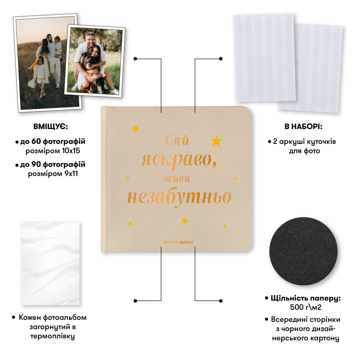 Фотоальбом «Сяй яскраво, живи незабутньо» був створений саме для того, щоб дбайливо оберігати ваші найщасливіші згадки. Про довгоочікувану зустріч та теплі обійми; про затишну сімейну вечерю та посиденьки за настілками у дружньому колі.