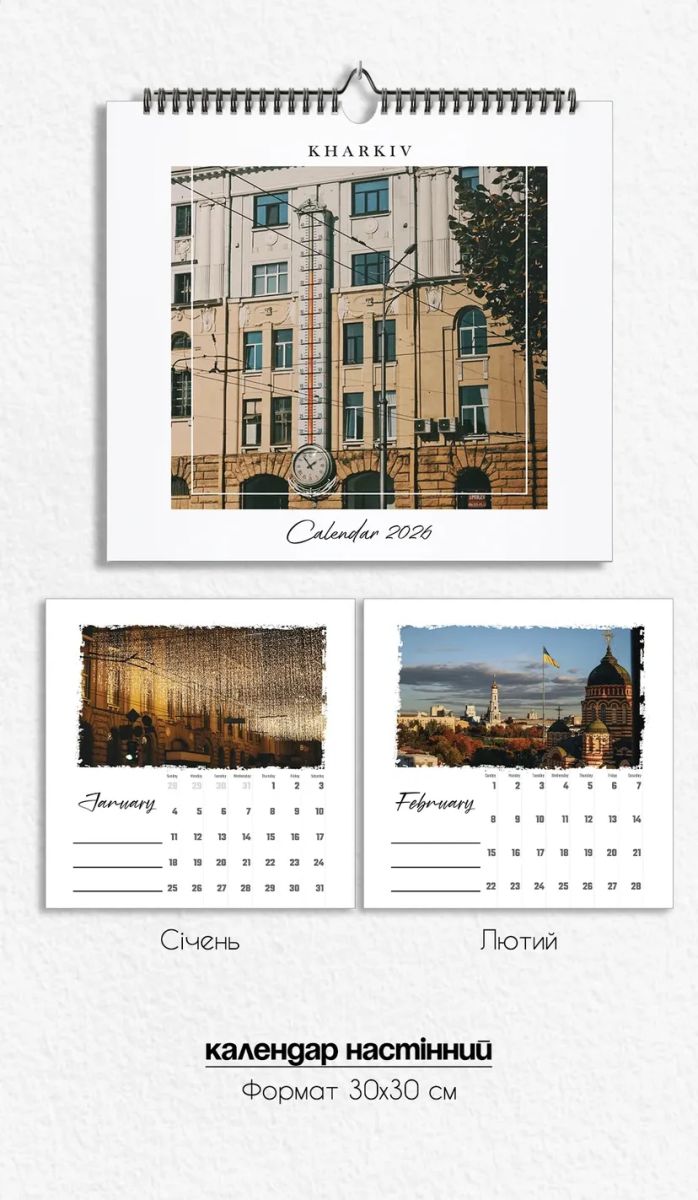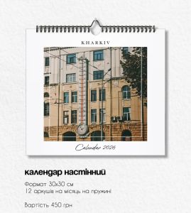 Харківський календар на 2026 рікФормат: 30*30 смНа пружині з ригелем12 авторських фотографій Харкова