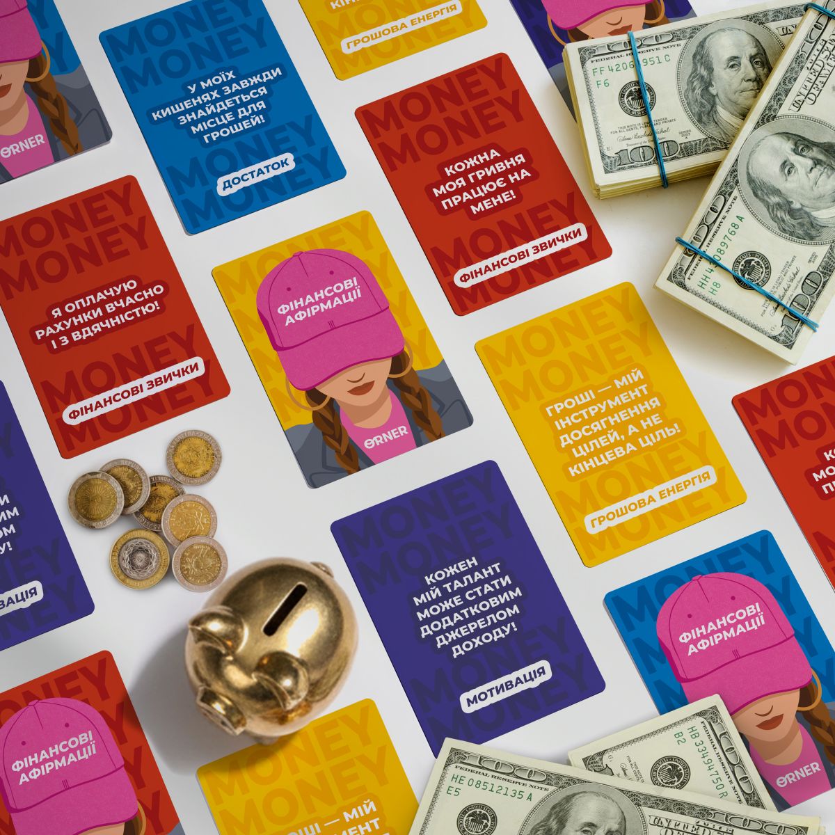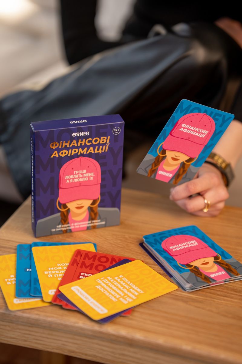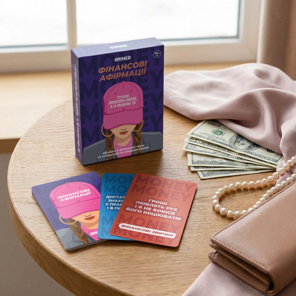Усередині зібрано 48 карток з афірмаціями, поділених на 4 категорії: грошова енергія, достаток, мотивація, фінансові звички. Вони допоможуть налагодити ваші стосунки з грошима, сформувати нові позитивні фінансові установки, зруйнувати упереджені думки щодо грошей та налаштуватися на відчуття стабільності, впевненості й цінності себе та власної праці.