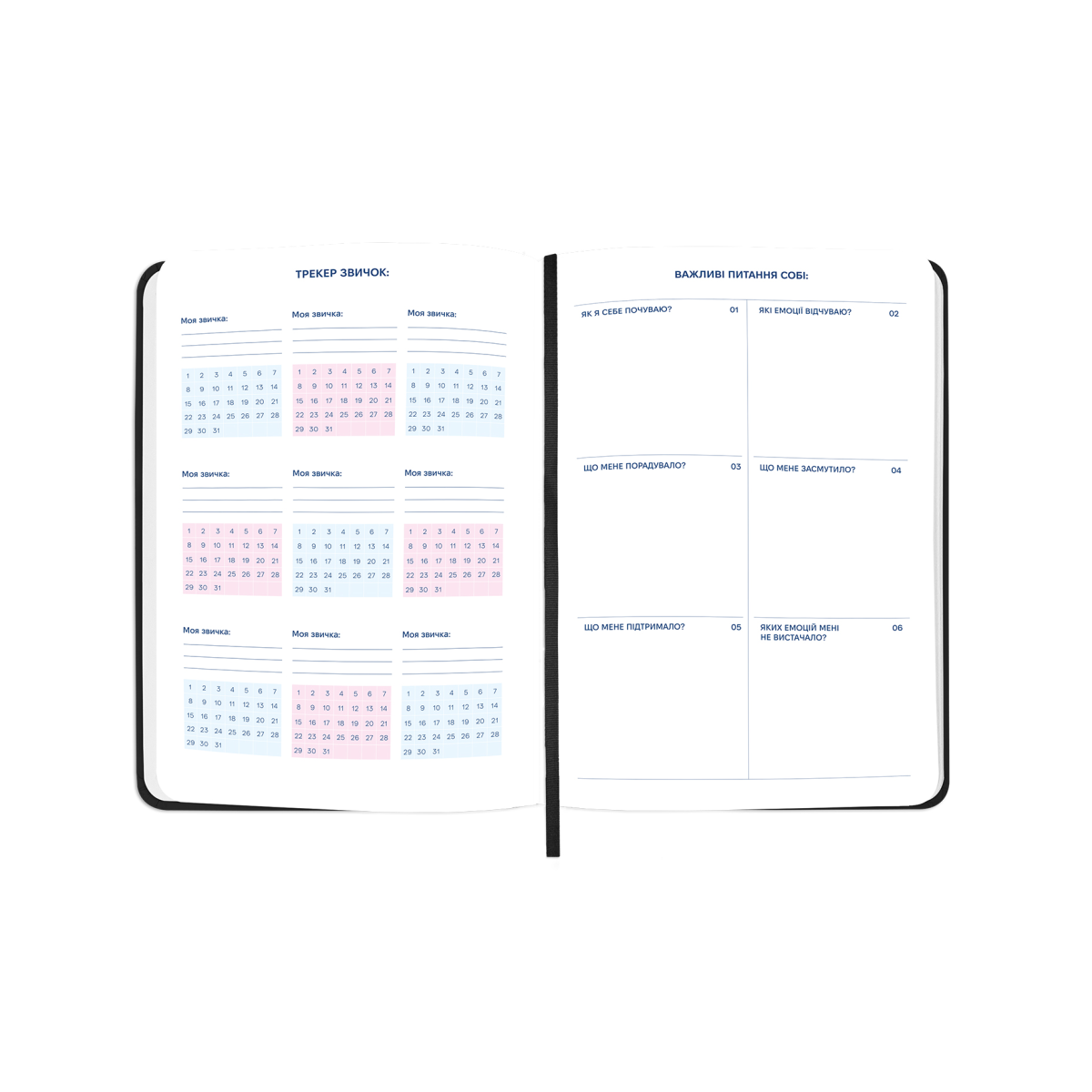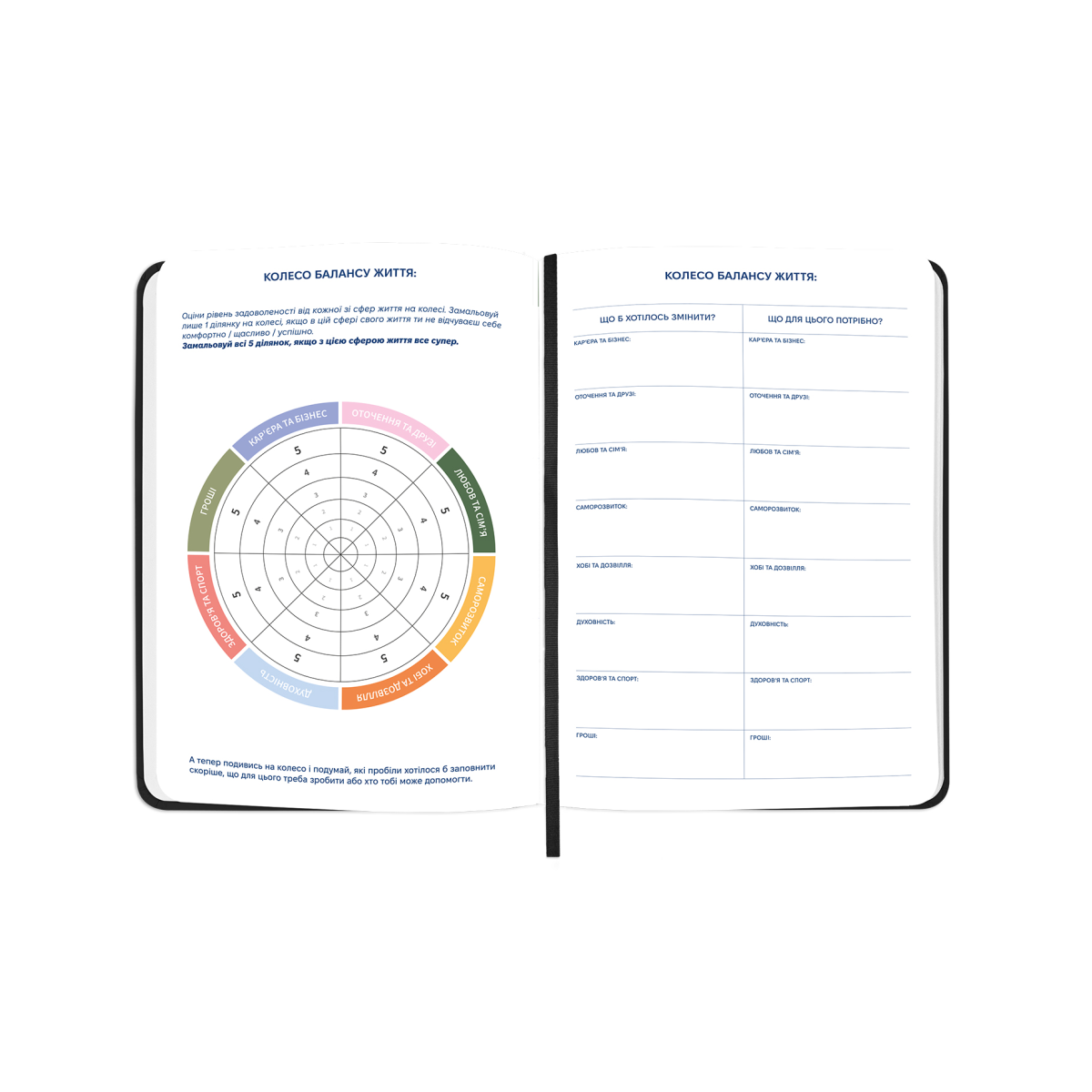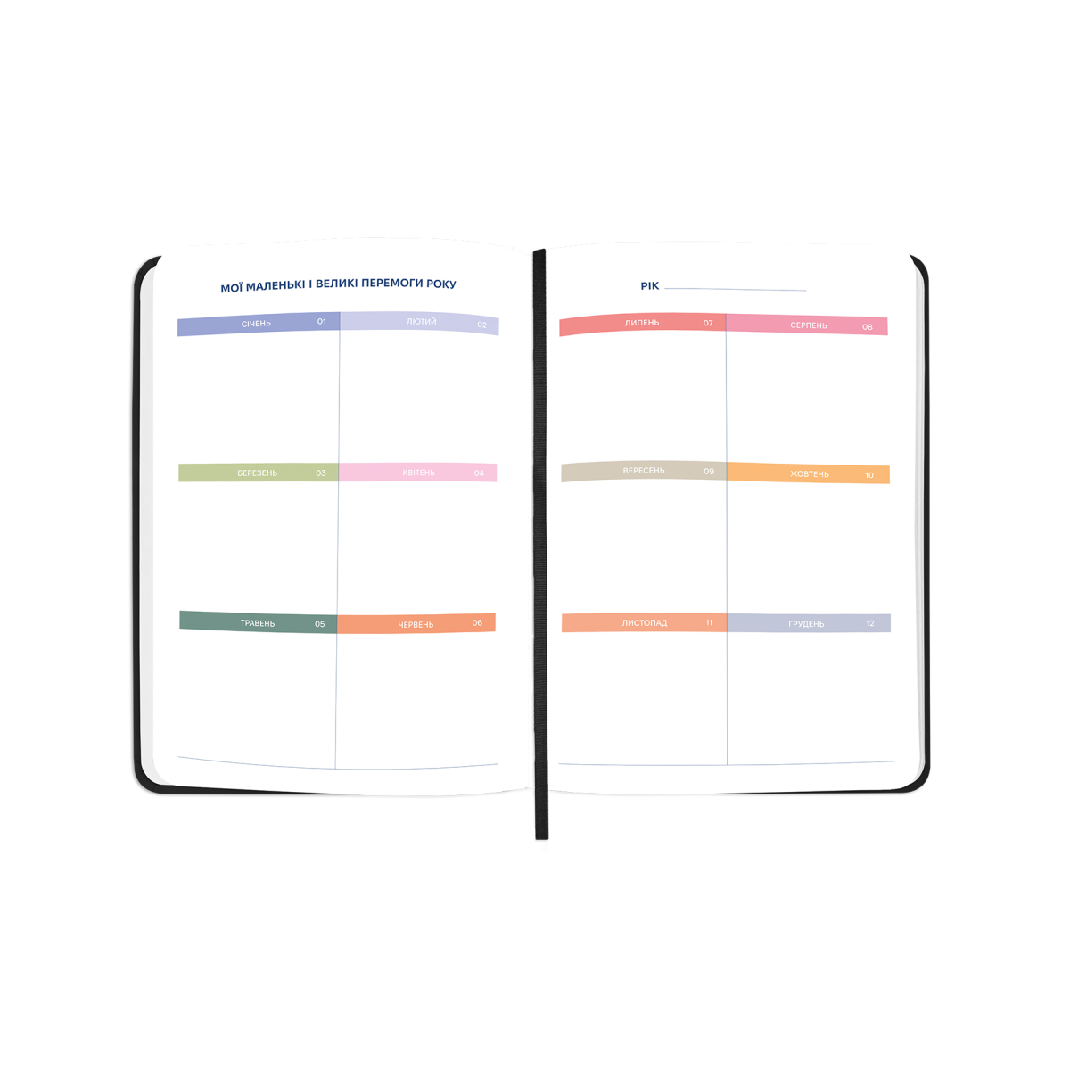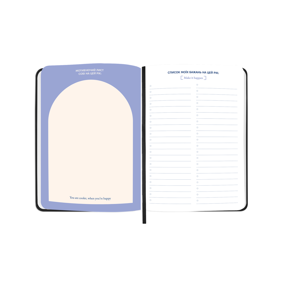 - Додаткові розвороти: план цілей на рік, дошка бажань, мотивуючий лист собі, колесо балансу, списки фільмів та книг, трекери звичок, важливі питання собі, сторінки в крапку для нотаток, маленькі і великі перемоги року, лист-подяка собі