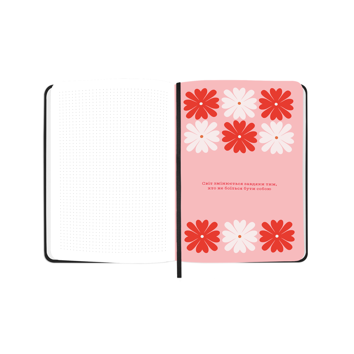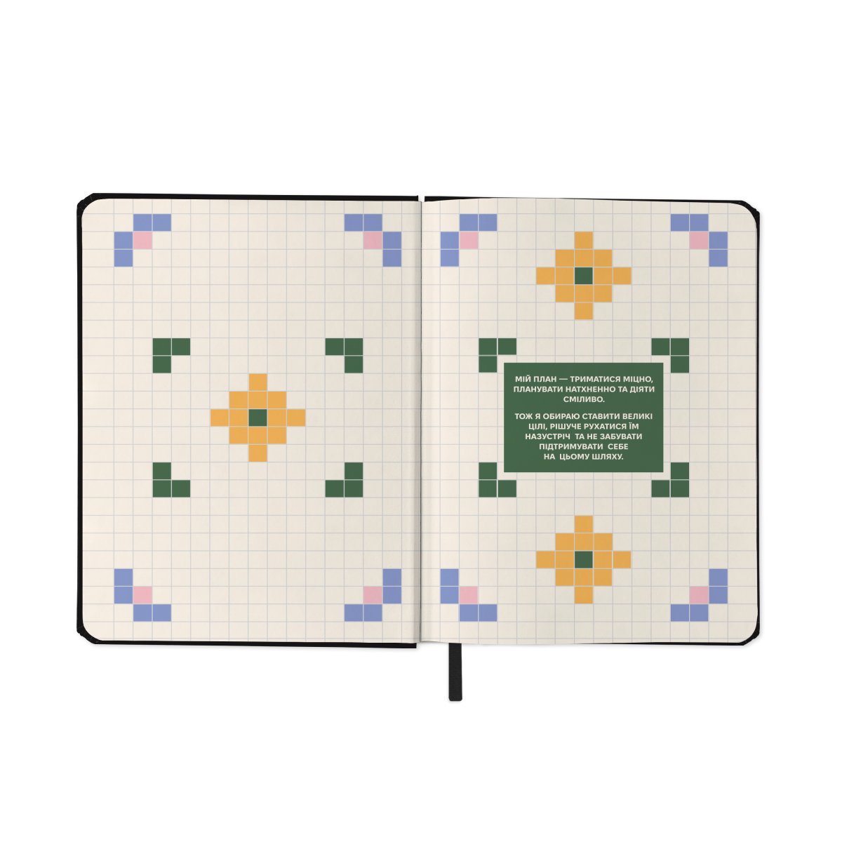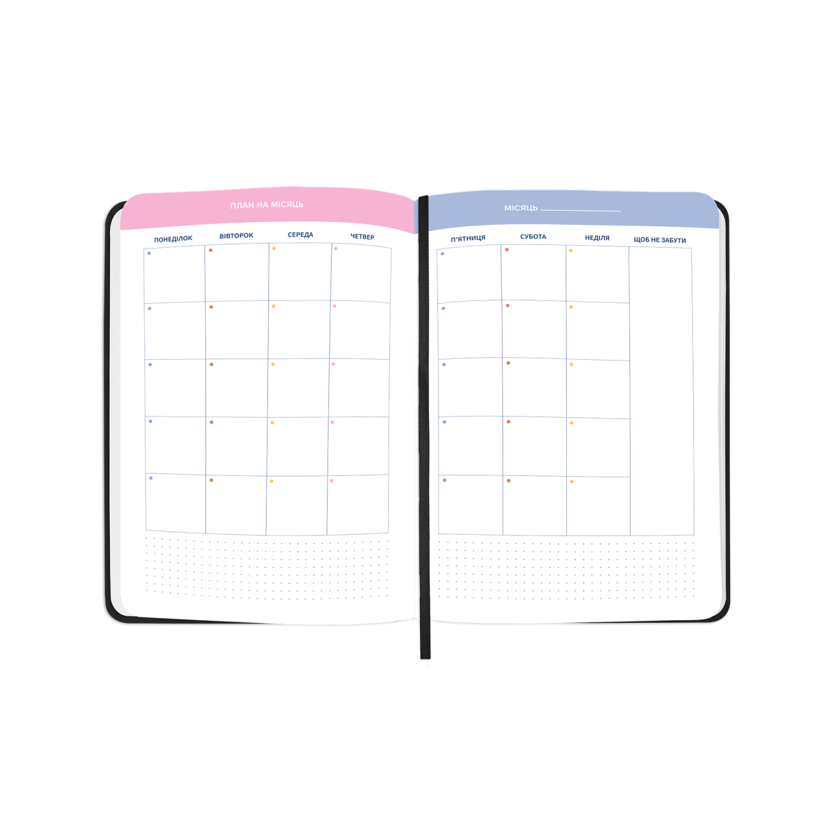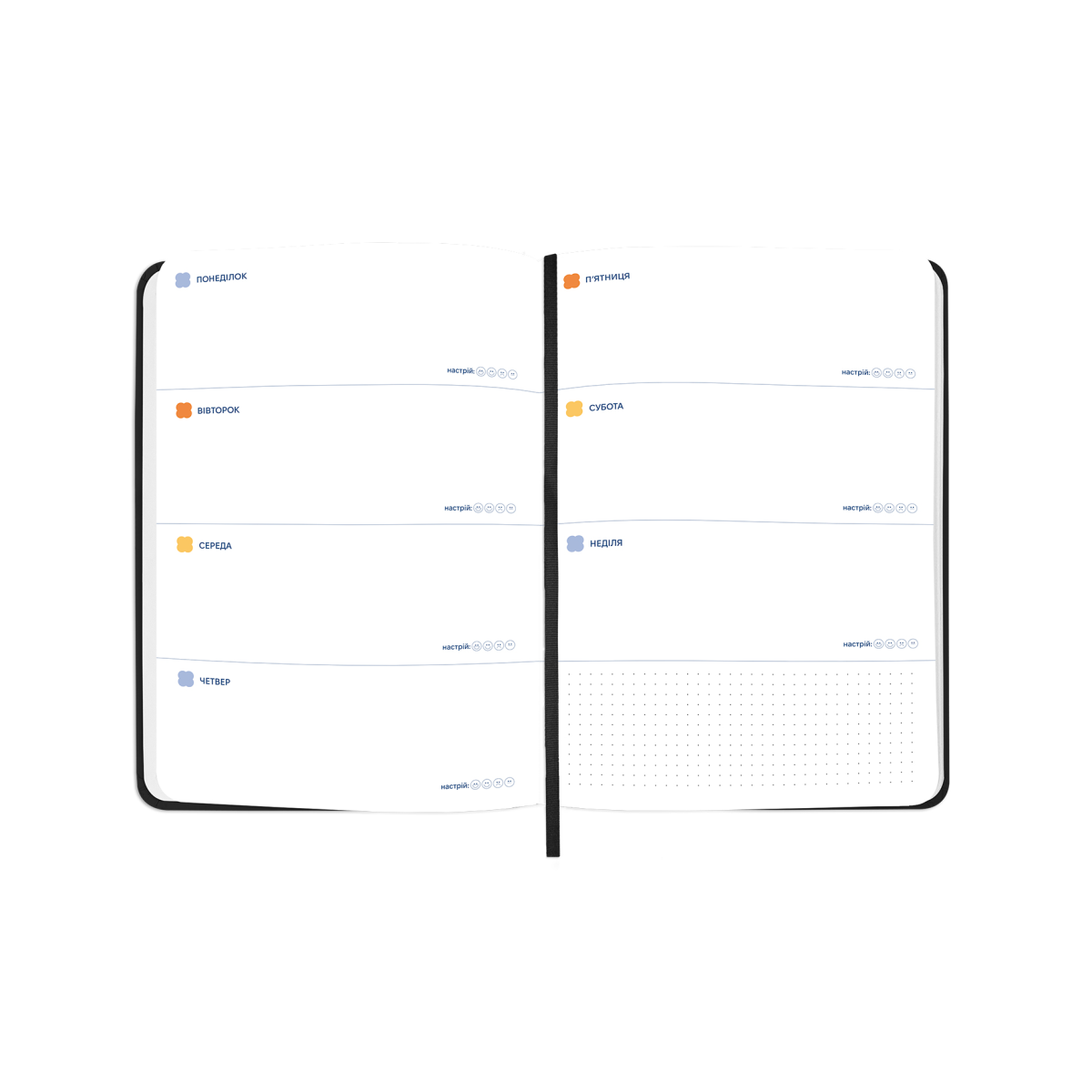 - Додаткові розвороти: план цілей на рік, дошка бажань, мотивуючий лист собі, колесо балансу, списки фільмів та книг, трекери звичок, важливі питання собі, сторінки в крапку для нотаток, маленькі і великі перемоги року, лист-подяка собі
