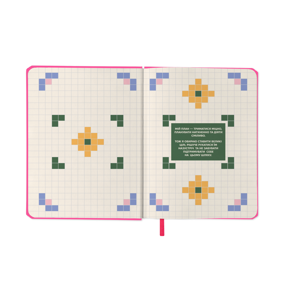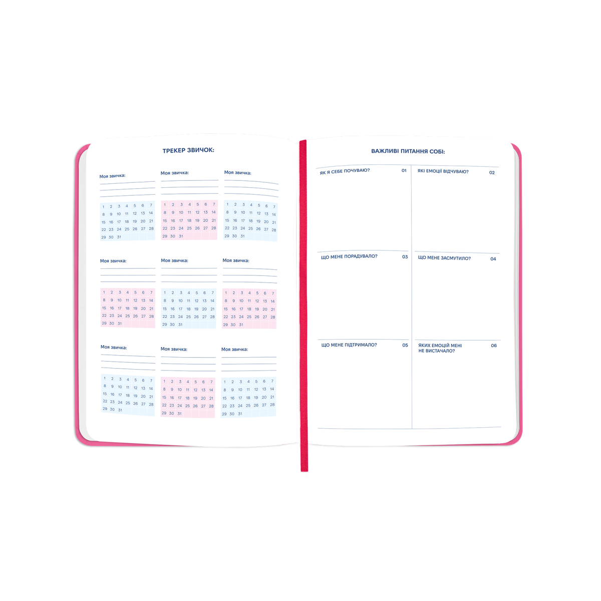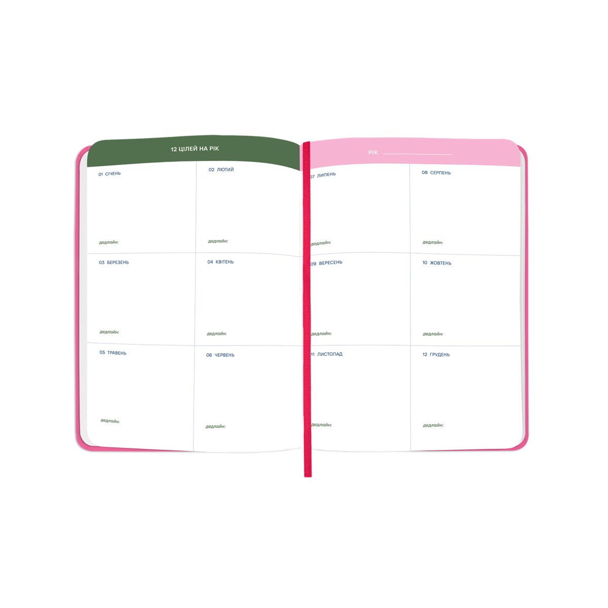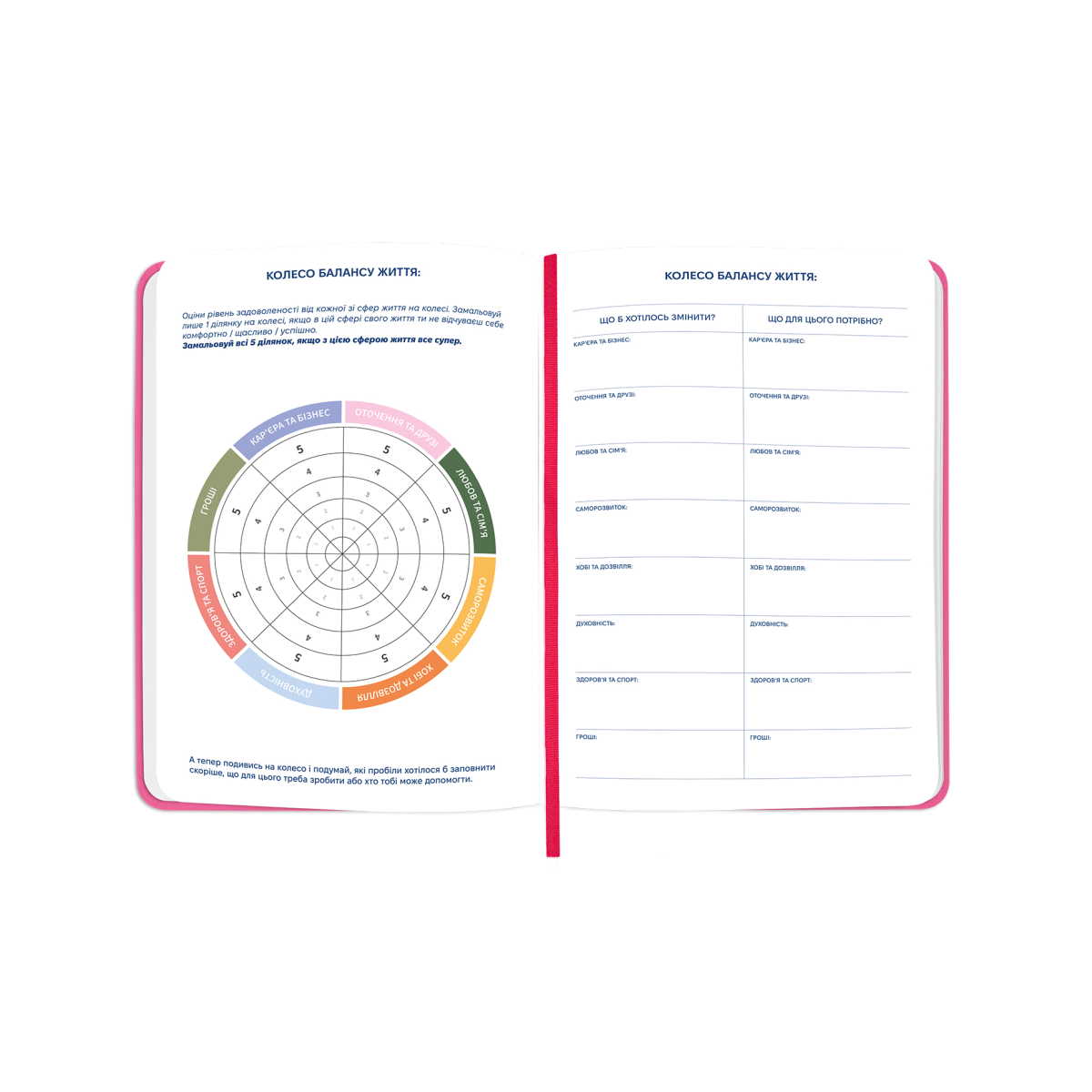- Додаткові розвороти: план цілей на рік, дошка бажань, мотивуючий лист собі, колесо балансу, списки фільмів та книг, трекери звичок, важливі питання собі, сторінки в крапку для нотаток, маленькі і великі перемоги року, лист-подяка собі