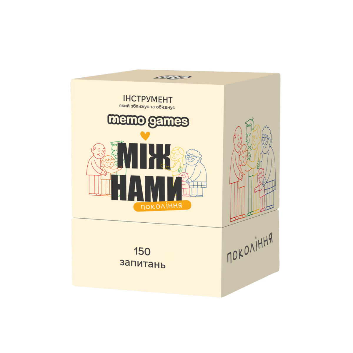Комплектація настільної гри «Між нами: покоління»:- 150 карток із запитаннями з 6 категорій