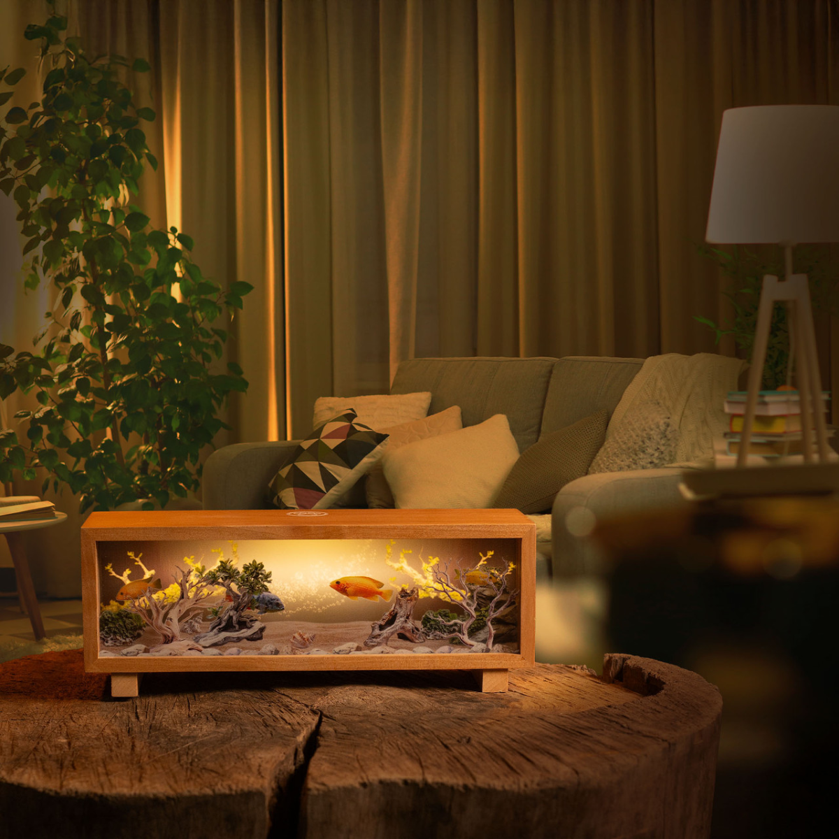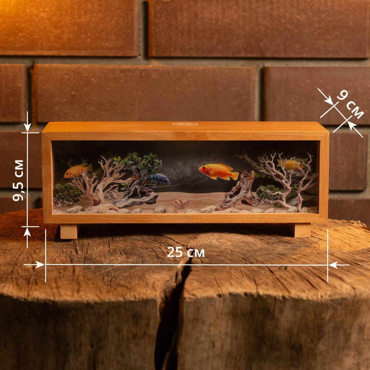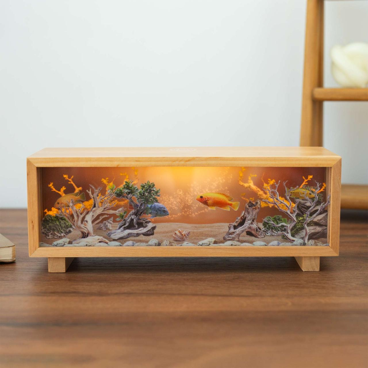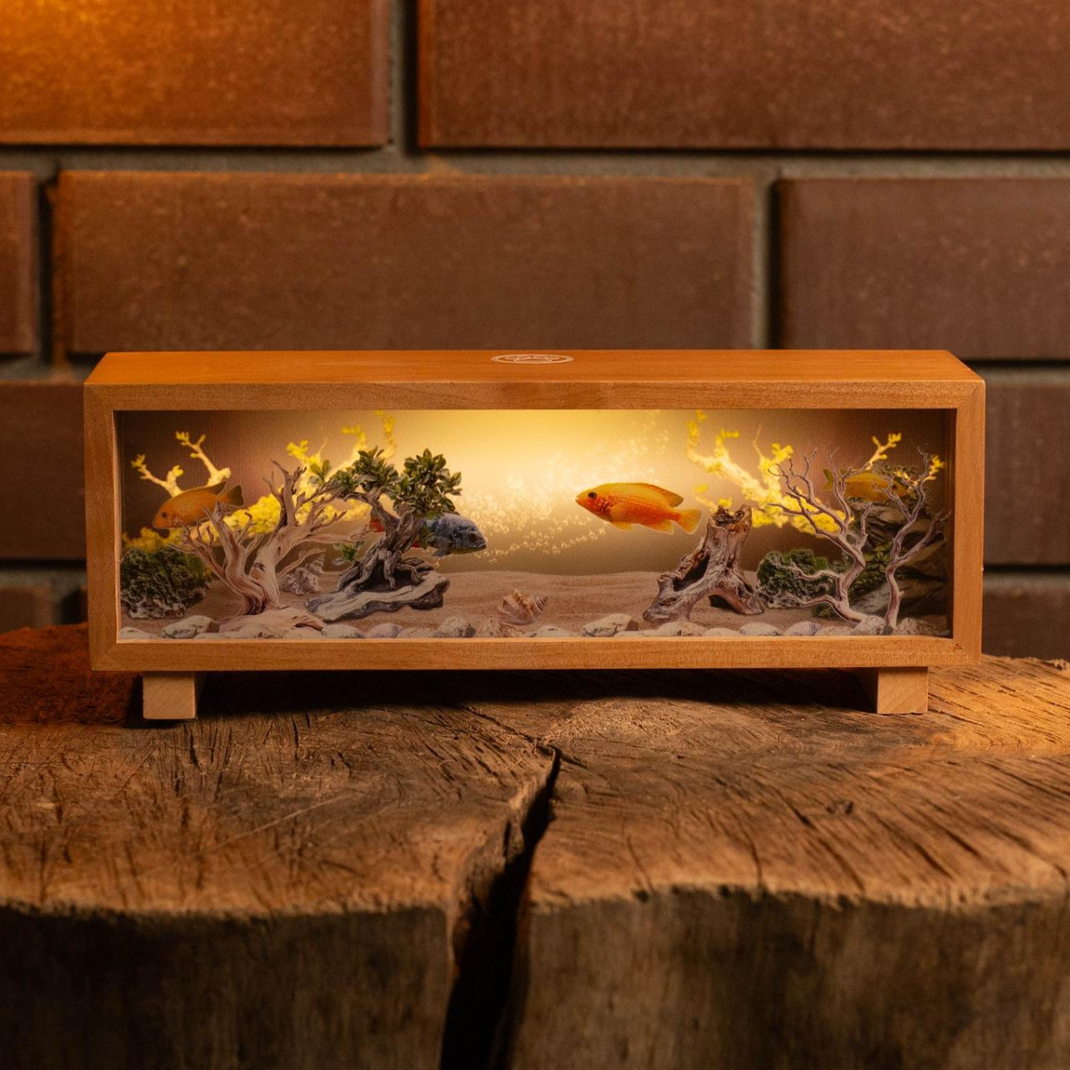 Цей нічник — як підводна пауза в щоденній метушні. У центрі — золота рибка, ніби жива, спокійно мандрує поміж коралів, гілля та водоростей. Легка гра світла і тіней створює ілюзію руху води, а напівпрозора глибина викликає відчуття, ніби ти справді зазирнув усередину акваріуму.