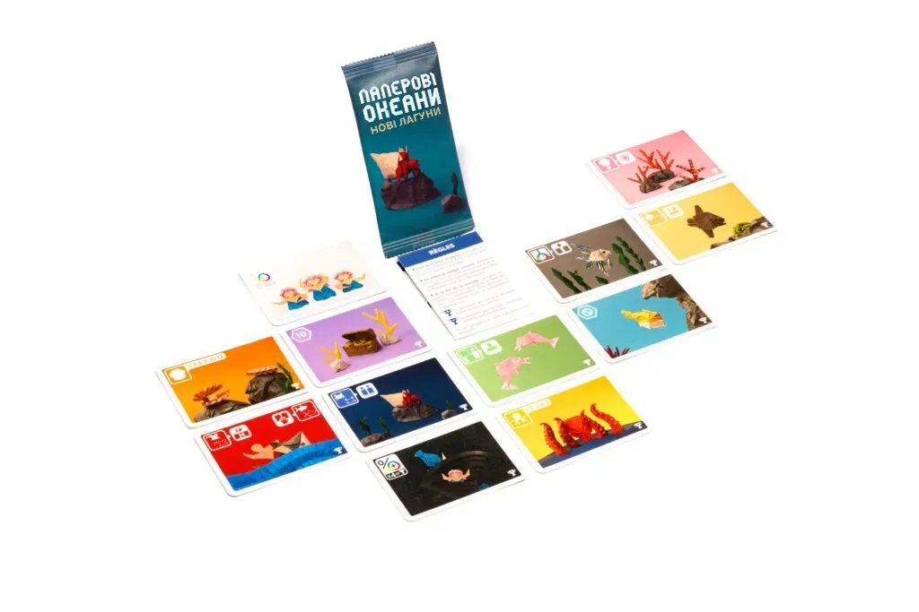 «Паперові Океани. Нові Лагуни» — доповнення до елегантної карткової гри на збирання сетів «Паперові Океани». Розширення вводить 12 карт подій, що будуть змінювати правила протягом партій. Це додає різноманіття, динаміки та суперницької напруги, адже нове правило, що може полегшити чи ускладнити гру, впливатиме на гравців залежно від їхніх результатів.
