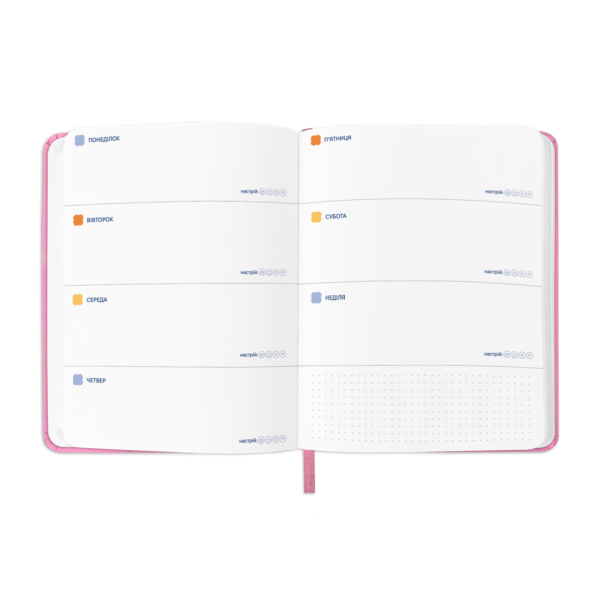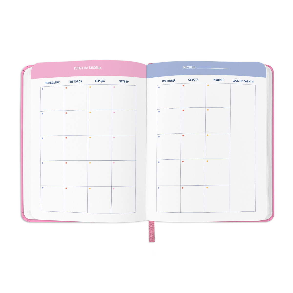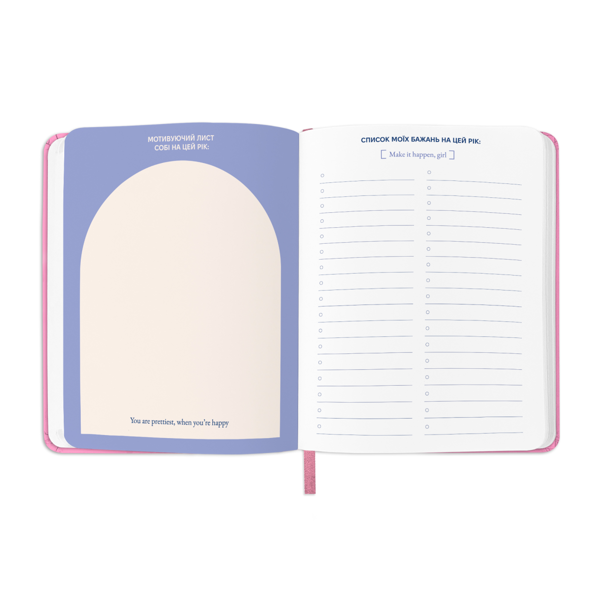 - Додаткові розвороти: план цілей на рік, дошка бажань, вішлісти, трекер звичок, пусті ліновані сторінки для записів, розворот підсумків року