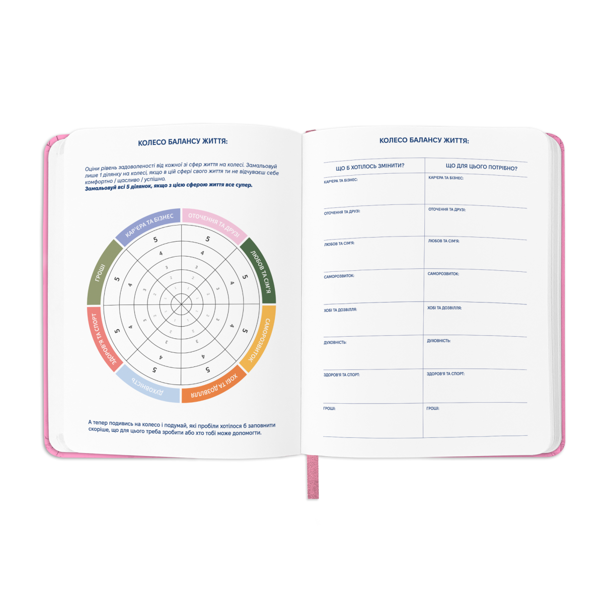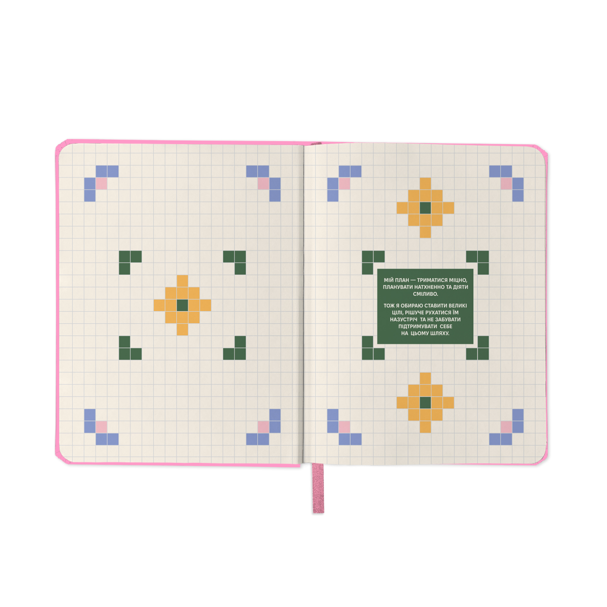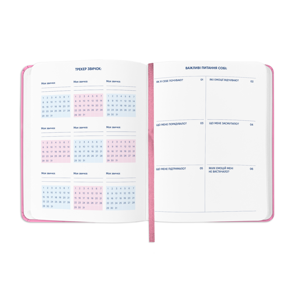 - Додаткові розвороти: план цілей на рік, дошка бажань, вішлісти, трекер звичок, пусті ліновані сторінки для записів, розворот підсумків року