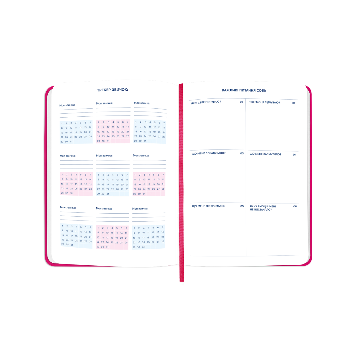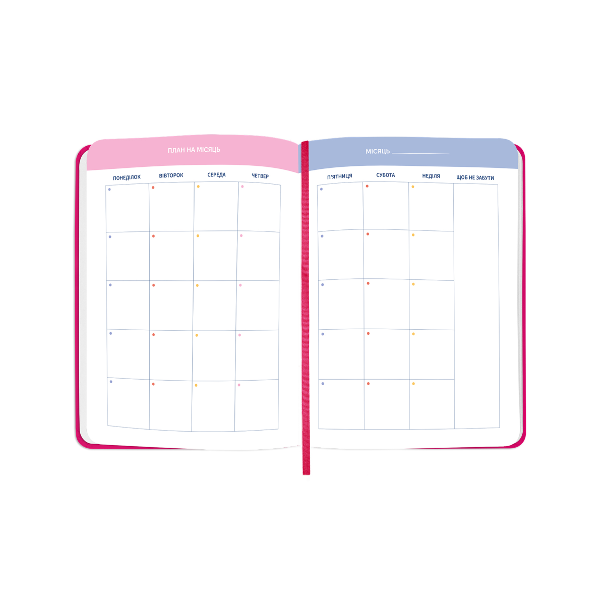- Додаткові розвороти: план цілей на рік, дошка бажань, вішлісти, трекер звичок, пусті ліновані сторінки для записів, розворот підсумків року