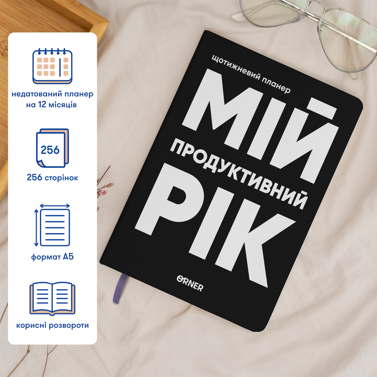 - Додаткові розвороти: 5 щотижневих розгортів на місяць, щомісячний трекер звичок, трекер витрат, цілі на рік, плани на місяць, чеклісти, дошка бажань, колесо балансу, список улюблених книг, фільмів, подкастів, курсів, сторінка щастя, результати року