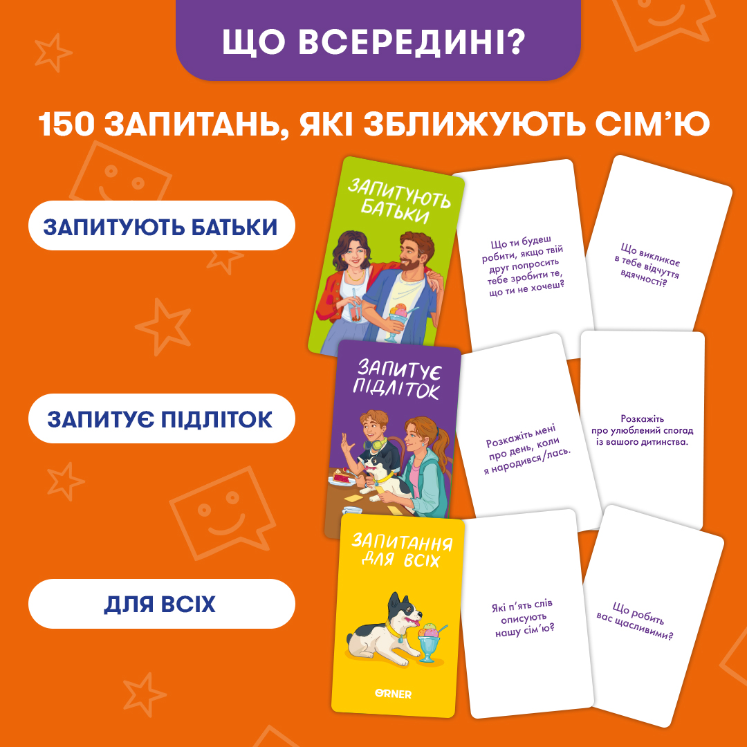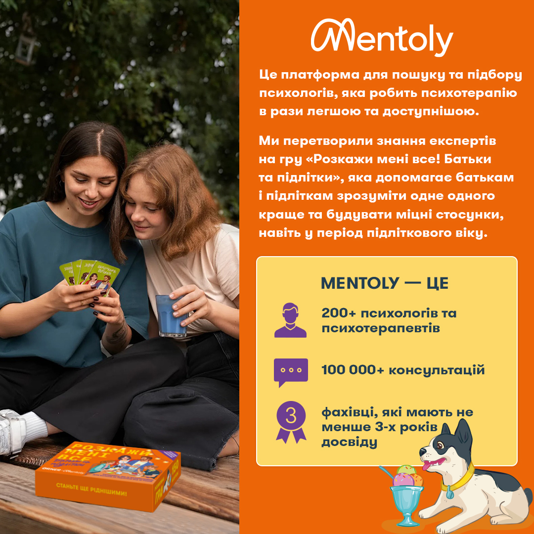 Розмовна гра «Розкажи мені все! Батьки та підлітки» була створена для того, щоб ваші щирі розмови на найважливіші теми відбувалися органічно та без зайвого тиску. Всередині є запитання для батьків, дітей та спільні, а теми охоплюють усе — від дружби та емоцій до мрій і щоденних викликів.