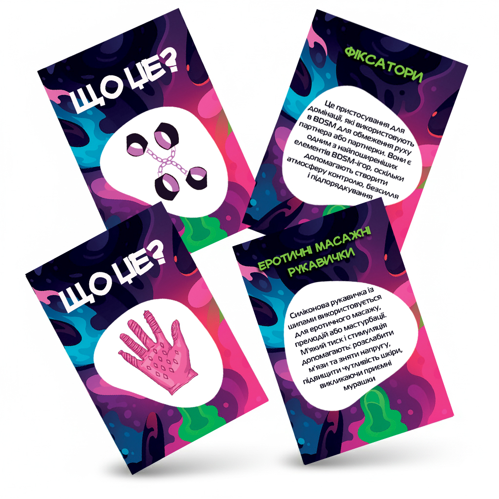 «ЩО ЦЕ?» – це максимально відверта та смішна настільна гра для дорослих компаній, яка гарантовано змусить вас червоніти від здивування та сміятися до сліз. Це не просто гра, це квиток у світ інтимних відкриттів!
