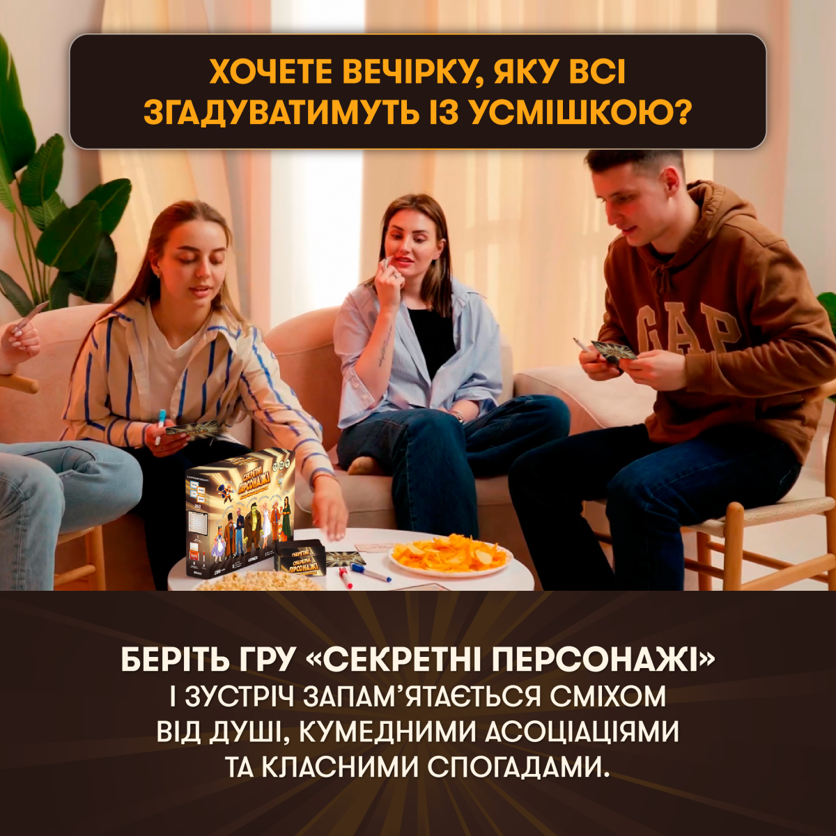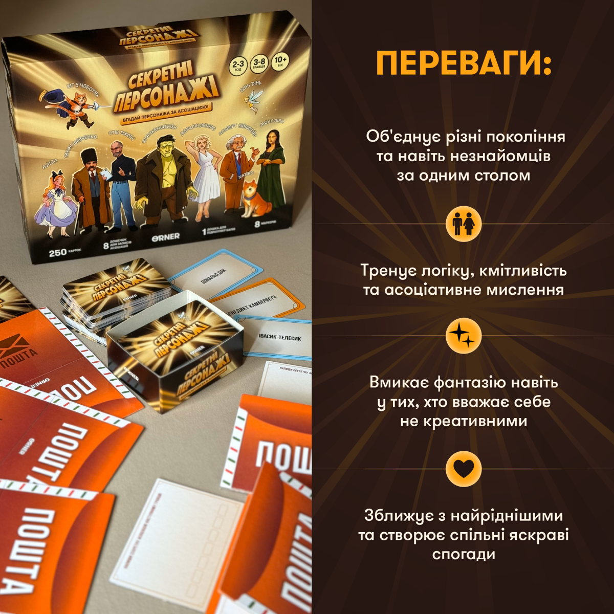 «Секретні персонажі» — настільна гра, де вам треба буде вгадувати відомих вигаданих та реальних персонажів за підказками-асоціаціями.