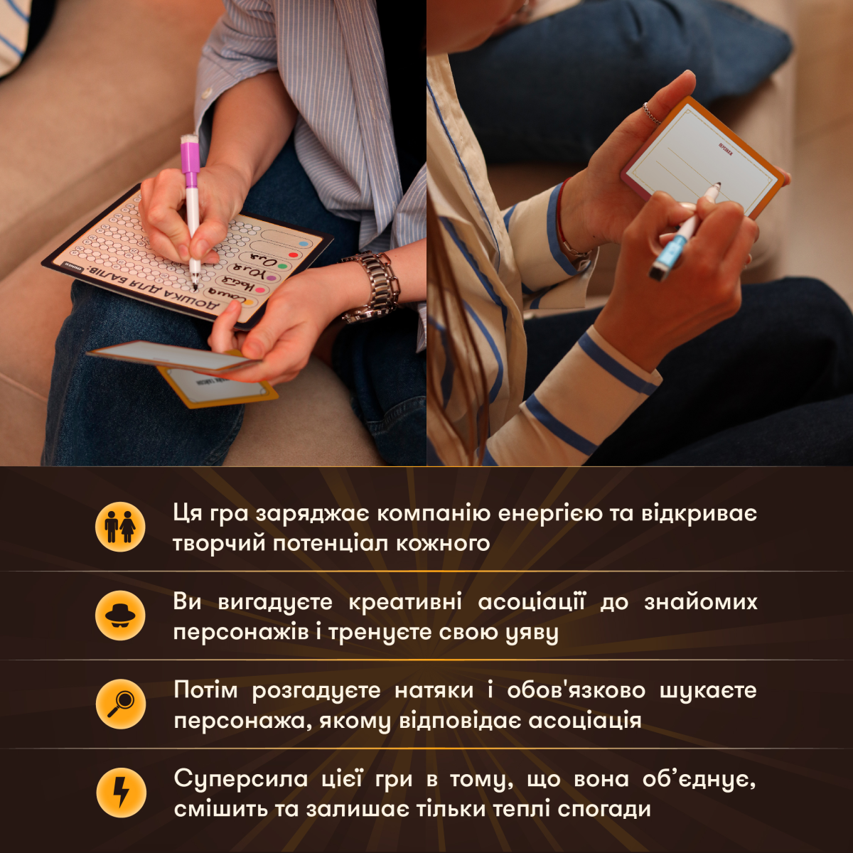 Спочатку ви отримаєте картку з ім’ям персонажа, запишете свою асоціацію із ним, а даааалі почнеться ланцюжок асоціацій, кожна з яких вестиме вас до істини… або навпаки, трішки віддалятиме від неї!