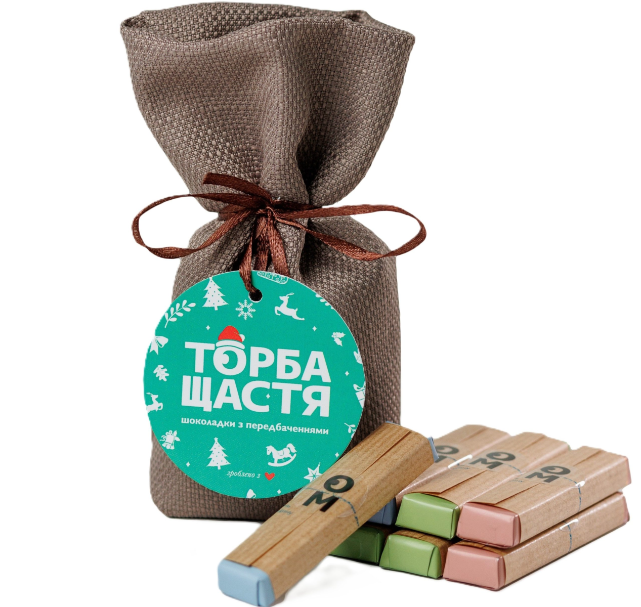 Порадуйте когось особливого нашою «Торбою Щастя» — солодким подарунком, наповненим асортиментом з семи смачних шоколадок, кожна з яких містить веселе передбачення чи надихаюче повідомлення. Ідеально підходить для того, щоб принести посмішки та дотик магії в будь-який день!