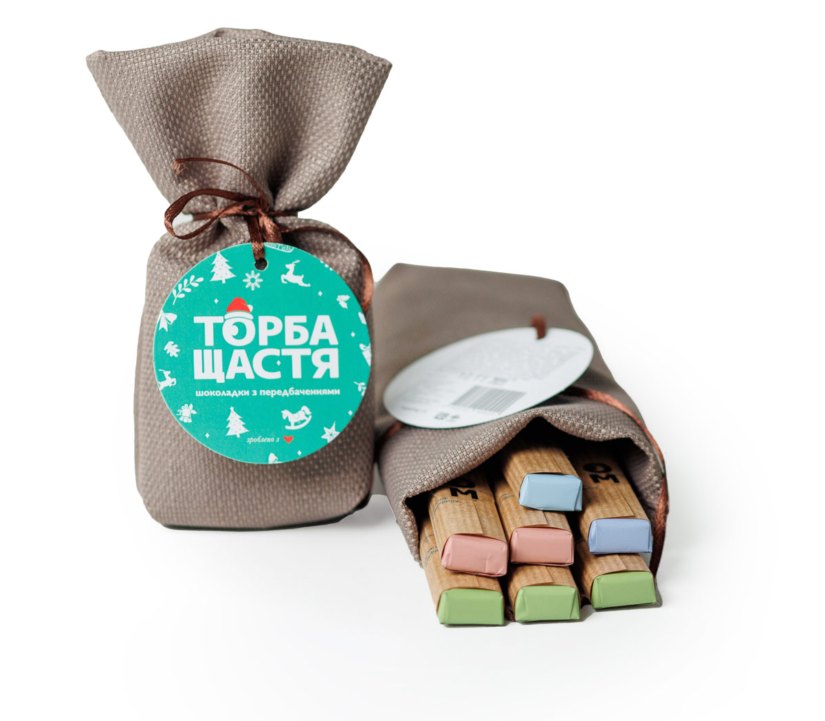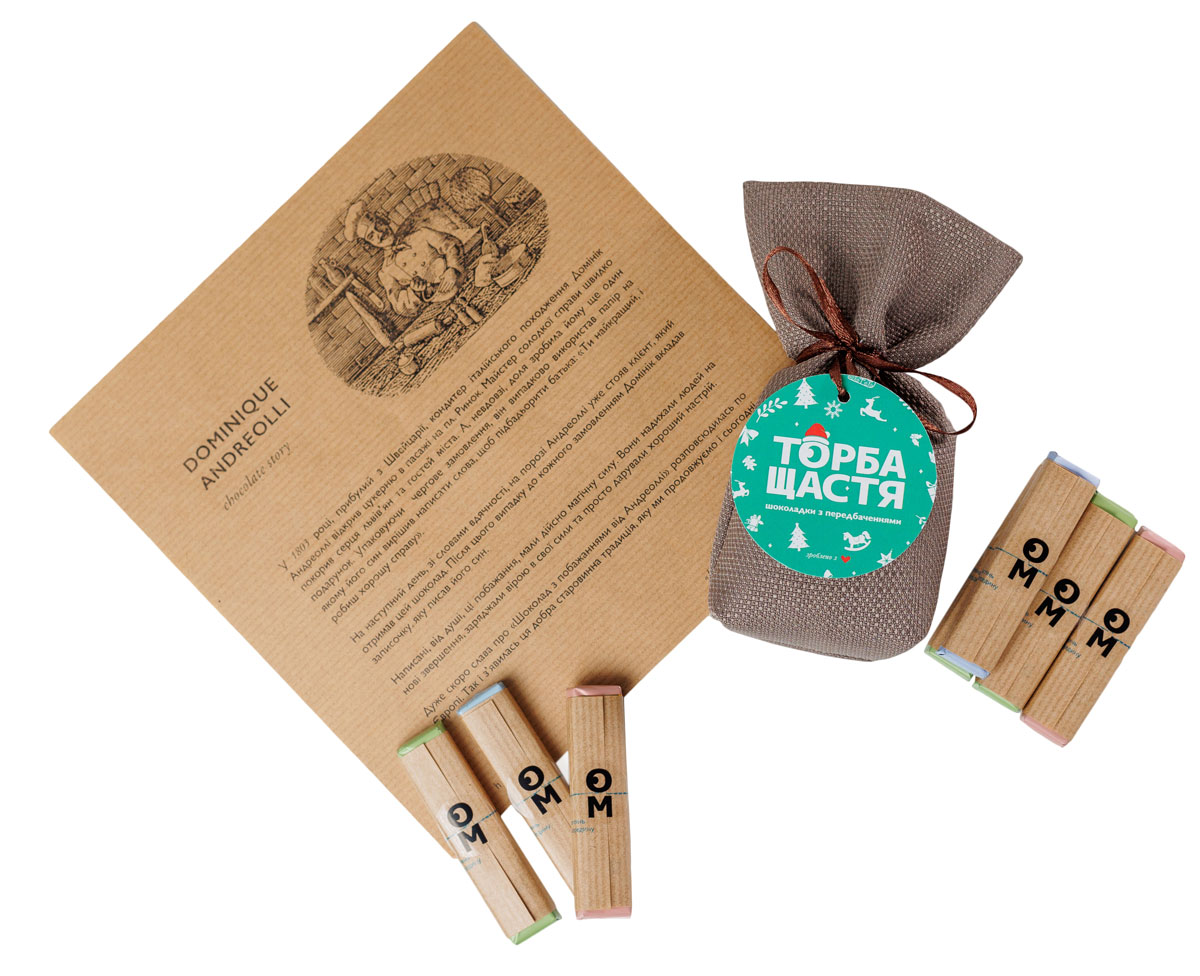 Кожна шоколадка вагою 12,5. Асорті дуже смачного шоколаду з ніжними начинками (чорний з солоною карамеллю, чорний з начинкою лимонний чізкейк, молочний з трюфельною начинкою та молочний з начинкою ягідний чізкейк). Люди кажуть, що дуже смачно. Кожна шоколадка з унікальним креативним та добрим побажанням, яке дублюється двома мовами українською та англійською. Різновид-понад 1500 штук, тому ймовірність повторів мізерно мала. І кожна Торба Щастя з своїм унікальним набором. Натуральна полотняна тканина дуже приємна на дотик та підкреслює цінність подарунку. І таке приємне відчуття розв’язати торбинку і витягнути шоколадку з побажанням-передбаченням, яке адресується саме Тобі. Ми самі не знаємо як таке трапляється, але магія, безперечно, присутня. Всі, хто куштує шоколад і читає побажання, відзначають, що воно призначалось саме йому.