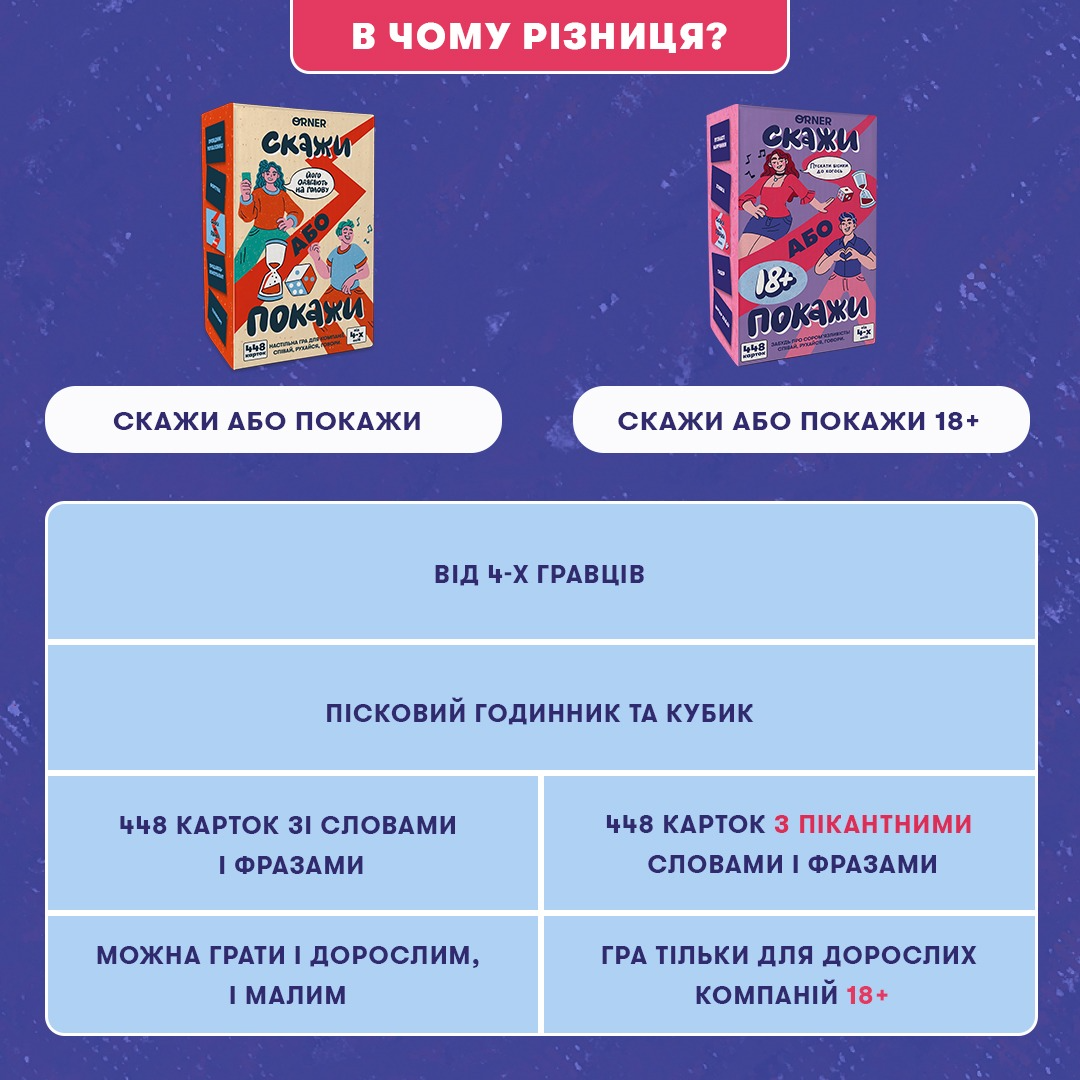 Скажи або покажи 18+ — це настільна гра для вечірки, яка поєднує конкурси на пояснення та показ слів гарячої тематики. Вона підійде як для великої компанії, так і для камерних посиденьок від 4 людей.