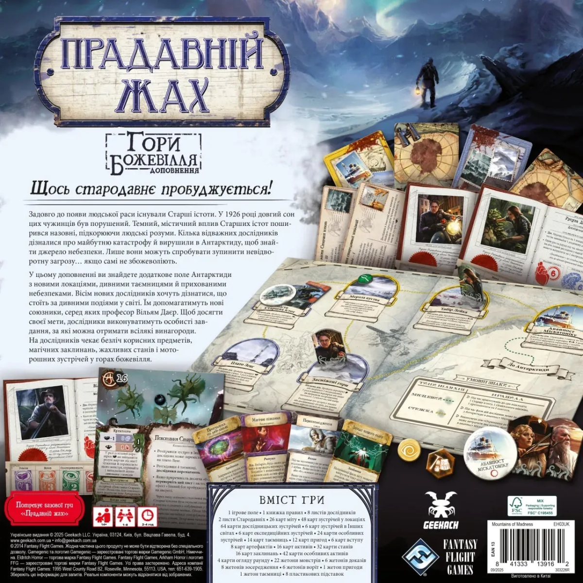 Комплектація настільної гри "Прадавній жах. Гори божевілля (Eldritch Horror: Mountains of Madness)":