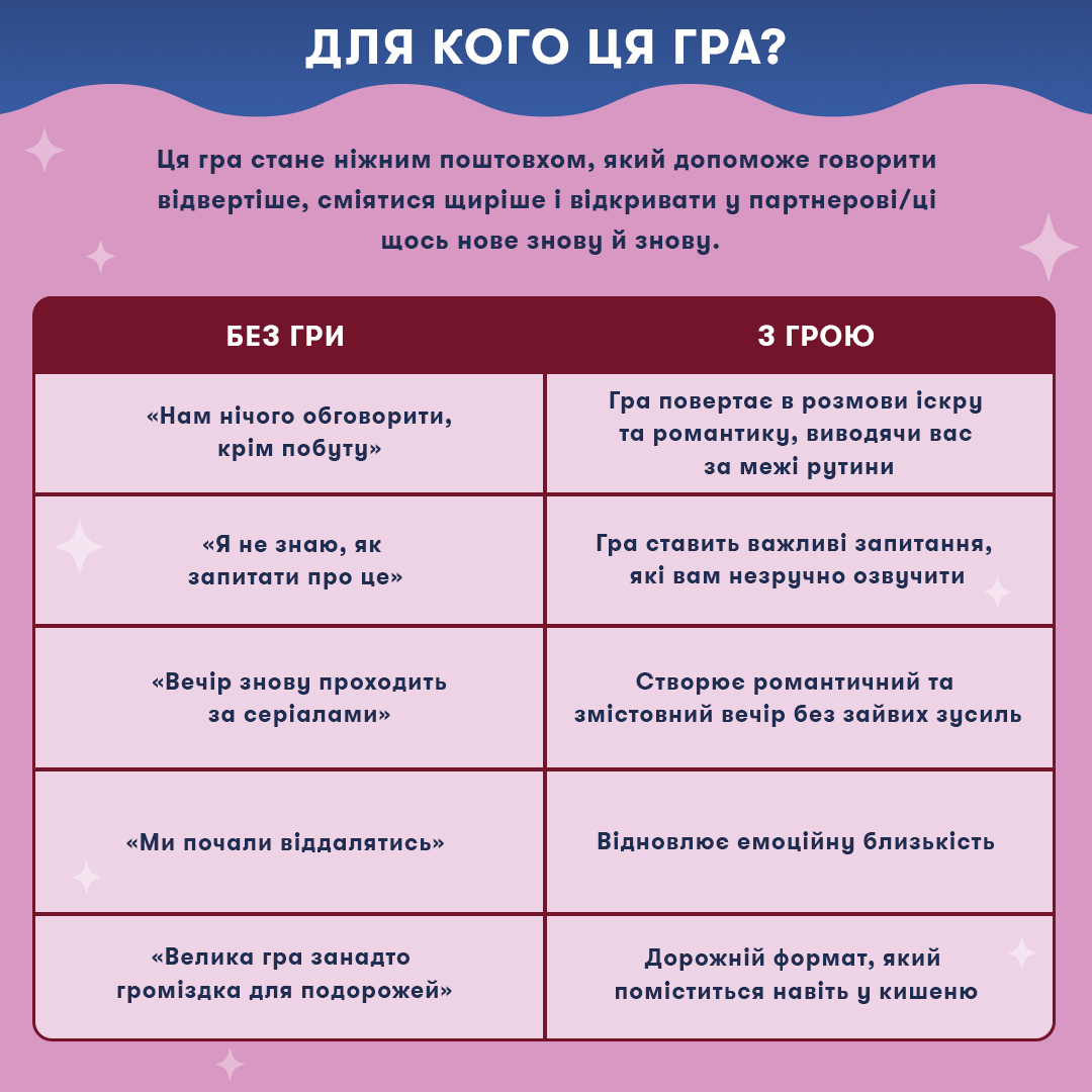 Всередині — 53 картки із запитаннями, які вибудують класний діалог, піднімуть цікаві теми та спонукатимуть відкритися одне одному ще більше і з неочікуваних сторін.